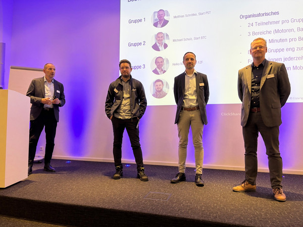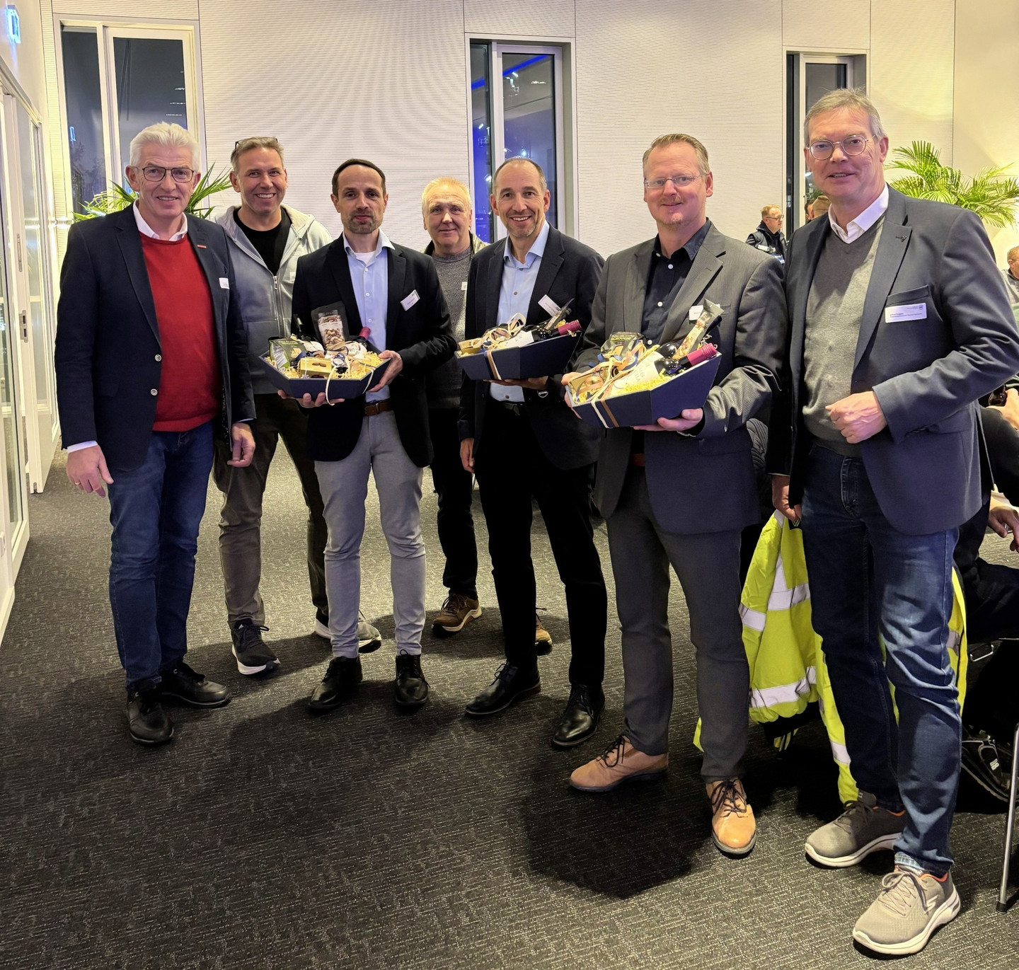 Obermeister Thomas Bäumer bedankte sich mit Präsenten bei den vier Referenten für die interessante Vorstellung der Prüfbereiche.